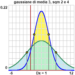 A destra sono rappresentate la distribuzione gaussiana di media 3 e sqm 2 e quella di sqm 4. Sono rappresentate dalla formula seguente, in cui "s" rappresenta lo sqm (o deviazione standard):