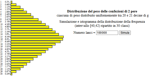 | Una azienda produce pere Abate. La pere prodotte sono di varia misura (il peso va da poco più di un etto a quasi tre etti) e sono commercializzate sia "sfuse" che in confezioni "da 4 hg" composte da due pere. La legge richiede che una confezione venduta come "da 4 hg" contenga "almeno" 4 hg; quindi la azienda, per queste confezioni, seleziona pere con peso maggiore o uguale a 200 g e inferiore 210 g. Supponiamo che in questo intervallo le pere prodotte si distribuiscano uniformemente. |