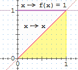 | la funzione di densità (teorica) di Rnd: x → 1 | la sua funzione di ripartizione: x → Pr(uscita < x) = x |
