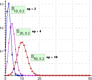 Il grafico della legge binomiale Bn, p di ordine n e "probabilità di successo nella singola prova" p quando n è molto grande, è pressoché simmetrico rispetto alla retta verticale che ha per ascissa la media, anche se p ≠ 1/2.A lato sono raffigurati per p = 0.2 i casi n = 50, 20, 10 (i punti che rappresentano P(N=k) per k alto hanno ordinata trascurabile rispetto al punto modale, per cui appaiono confusi con l'asse orizzontale). Più n è piccolo, più è evidente la asimmetria, con una "coda" verso destra. |