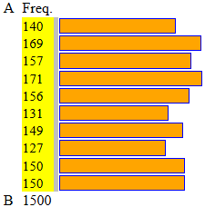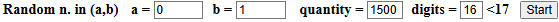![]() | A = 0 B = 1 10 intervalli di ampiezza 0.1 n = 1500 min = 0.0021983563208802 max = 0.9976128764578782 media = 0.489953283095 Anche in questo caso le colonne tendono ad avere la stessa lunghezza. [vedi qui per più dati con meno cifre] | |