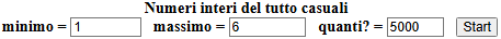 ![]() | A = 0.5 B = 6.5 6 intervalli di ampiezza 1 n = 5000 min = 1 max = 6 media = 3.5024 Con 100 prove le colonne sarebbero molto diverse, al loro aumentare tendono ad avere la stessa lunghezza. | |