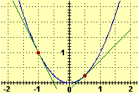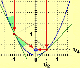 Quindi il grafico di x → x2 nel punto di ascissa x ha pendenza 2x. In questo modo posso calcolare facilmente la pendenza in qualunque punto del grafico, e tracciare la retta tangente passante per quel punto. Ad es. (vedi figura sopra a destra) per x = 1 la pendenza è 2, per x = 1/2 la pendenza è 1.