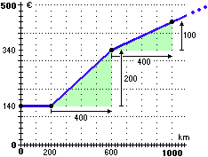 Il grafico del costo del noleggio per un giorno di un furgone in funzione della percorrenza. La ditta pratica una tariffa di 140 euro con un'aggiunta di 0.5 euro a chilometro per ogni chilometro di percorrenza eccedente i 200 km, che viene ridotta a 0.25 euro se si superano i 600 km di percorrenza [0.5 = 200/400, 0.25 = 100/400]