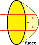 otterrei sempre rimbalzi che passano per questo punto, che viene chiamato fuoco della parabola. Il nome deriva dal fatto che se consideriamo uno specchio parabolico, ossia la cui forma sia descrivibile come la superficie generata dalla rotazione di una parabola attorno al suo asse (vedi figura sopra a destra), se lo orientiamo in modo che l'asse sia diretto verso il sole, i raggi solari vengono tutti riflessi in modo da passare per tale punto: se collochiamo un oggetto infiammabile in tale punto, la concentrazione dei raggi solari (se lo specchio è opportunamente grande) può far sì che l'oggetto prenda fuoco. Viceversa, se collochiamo una lampadina nel fuoco (vedi figura a sinistra), i raggi luminosi che essa produce rimbalzano seguendo il percorso inverso, e vengono tutti proiettati parallelamente all'asse dell specchio. È questo il motivo per cui i fari di auto e torce elettriche sono dotati di uno specchio parabolico. L'esistenza di un fuoco è usata anche dalle antenne paraboliche: le onde che arrivano vengono riflesse nel fuoco dell'antenna, in cui è posizionato il dispositivo che capta le onde e le trasmette all'apparecchio televisivo. |