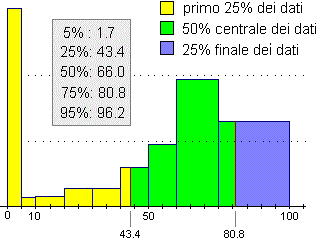 Il concetto di percentile - o quantile - generalizza quello di mediana valori medi 2]: la mediana è il dato che delimita il primo 50% dei dati (ordinati) dai rimanenti dati, se p è un numero tra 0 e 100, il percentile di ordine p (o p° percentile, se p è intero) è il dato che delimita il primo p% dei dati (ordinati) dai rimanenti dati. (è usato anche il concetto di quartile: il 1º quartile è il dato che delimita il primo quarto dei dati dai rimanenti, il 2º è quello che ne delimita i primi due quarti, e coincide con la mediana, e il 3º è quello che ne delimita i primi tre quarti) | ![]() |