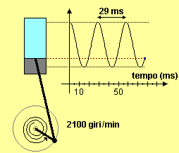 Quindi nel caso del pistone avremmo 1 ciclo ogni 0.029 secondi, ovvero 1000 cicli ogni 29 secondi: 1000/29 cicli al secondo, cioè circa 34.5 Hz. In questo caso ci conviene trasformare direttamente la frequenza espressa in giri al minuto, che già conosciamo: 1 min = 60 sec, per cui 2100 cicli al minuto diventa 2100/60 cicli al secondo, ossia 210/6 = 70/2 = 35 Hz.