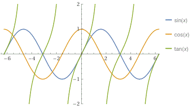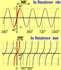 [ clicca qui per una costruzione animata dei grafici di sin e cos ] Il grafico a lato in basso è della funzione tangente, che, rispetto alle funzioni seno e coseno, ha periodo metà, di 180° (π). Infatti α e α+180° [in quanto direzioni opposte: |