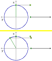 Man mano che P ruota la sua y (seno) un quarto di giro dopo diventa la sua x (coseno). In altre parole (vedi figura a destra) se ruoto di 90° il cerchio graduato iniziale la quota a cui si trova P non è più la sua ordinata ma la sua ascissa. Con una animazione simile alla precedente (vedi figura sotto a sinistra) ottengo il grafico della ascissa di P in funzione della rotazione complessivamente descritta dal raggio OP.