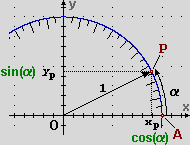 sin(α) è la seconda componente del versore di direzione α. In altre parole, la funzione seno esprime l'ordinata del punto P appartenente al cerchio di centro (0,0) e raggio 1 in funzione della direzione del vettore OP. Se a sin si danno in input α oppure α+360° o α+720° o , si ottiene sempre lo stesso output in quanto tali valori rappresentano la stessa direzione. Fisicamente possiamo interpretare questo fenomeno pensando a P che si muove lungo il cerchio con velocità di rotazione costante; sotto è riprodotta la situazione in cui P ruota a 30° al secondo, ossia fa un giro in 12 s; ogni 12 s P riassume la stessa posizione, e quindi in particolare la stessa ordinata. | |