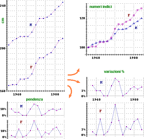Possiamo precisare questa osservazione calcolando le pendenze dei vari tratti che costituiscono i due grafici dei dati originali. Queste pendenze sono state rappresentate graficamente nella figura soprastante (in basso a sinistra): il loro andamento conferma che, dopo un periodo in cui il miglioramento è stato più netto per le femmine, per i due sessi si ha un progresso paragonabile.