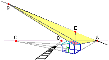 alla stessa altezza del tetto.A, E e D sono punti di fuga di rette che stanno sul piano di una delle facce del tetto; sono allineati, ma non sull'orizzonte in quanto non si tratta di un piano parallelo al piano orizzontale. Abbiamo anche visto alcuni aspetti della storia dell'arte legati a questo tema (alcuni di essi sono approfonditi in uno specifico