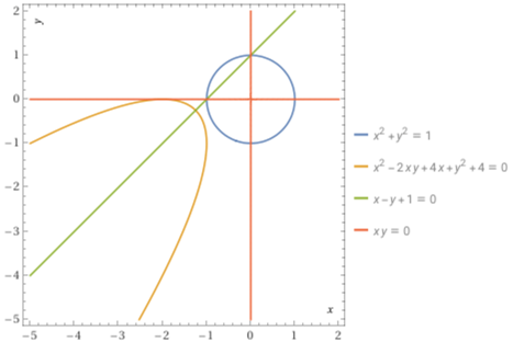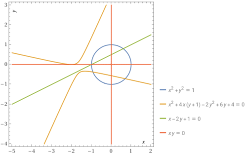 ![]() plot x^2+y^2=1, x^2 + y^2 - 2xy + 4x + 4 = 0, x-y+1=0, x*y=0, x=-5..2, y=-5..2 |