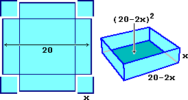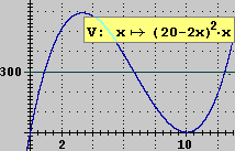 dal grafico di V (la funzione che a x associa il volume [in cm3] della scatola realizzabile tagliando da una lamiera quadrata di lato 20 [cm] quattro quadratini di lato x e operando successive piegature e saldature: vedi figura sotto a sinistra) riesco a capire che le soluzioni in [0,10] di