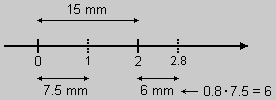 | Ad esempio se segno una tacca 0 e una tacca 2 a 15 mm di distanza, il punto 1 starà a metà strada, a 7.5 mm sia da 0 che da 1; il punto 2.8 starà a 2.8·7.5 = 21 mm dal punto 0 e (poiché 2.8 = 2+0.8) a 0.8·7.5 = 6 mm dal punto 2. | ![]() |