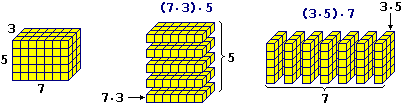 Con ragionamenti fisici ed esperimenti numerici (ad es. osservando che per contare i cubetti della figura seguente posso sia sommare 5 strati di 7·3 cubetti, cioè fare 7·3·5, che sommare 7 strati di 3·5 cubetti, cioè fare 3·5·7) possiamo convincerci che vale anche la proprietà del riordino del prodotto: