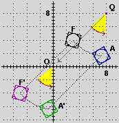 figura (1) sotto], può essere ottenuta anche operando una traslazione che mandi Q in O (e F in F'), ruotando di 45° attorno ad O (mandando F' in A') e poi ritraslando O in Q (mandando A' in A). Le