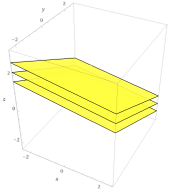 | 3 piani paralleli tracciati con WolframAlpha: plane x/3+y+z*2 = 0, plane x/3+y+z*2 = 1, plane x/3+y+z*2 = 2 |