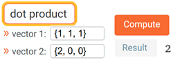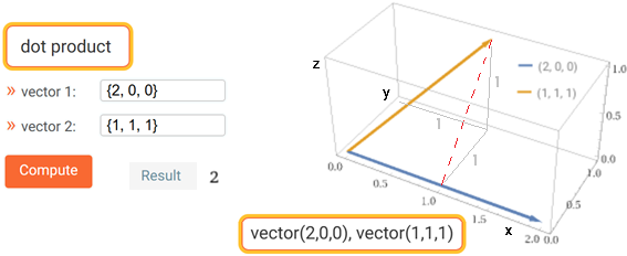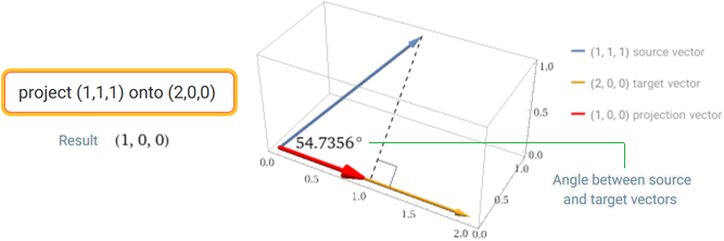 Ecco la rappresenatazione con WolframAlpha del prodotto scalare (2,0,0)·(1,1,1); il modulo di (2,0,0) è 2, la proiezione di (1,1,1) su (2,0,0) - vedi il tratteggio rosso - è 1, il loro prodotto è 2:
