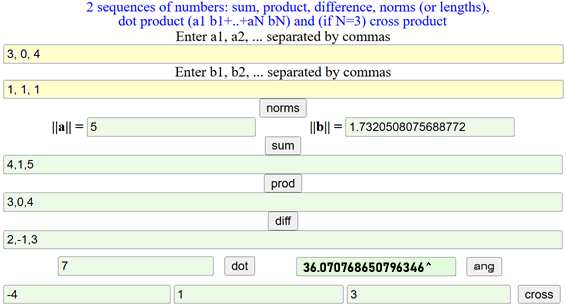 Per svolgere i calcoli con i vettori di può usare lo script "vettori" presente qui, il cui uso illustriamo con alcune operazioni riferite ai vettori (3,0,4) e (1,1,1).