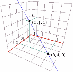 P = (3, 4, 0) + (−1, −3, 3)·t ovvero, indicando P con x = 3 − t y = 4 − 3t z = 3t. | |