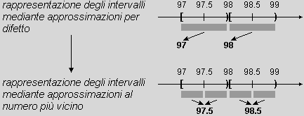 sopra, per le quali SommaDati/QuantitàDati vale 161.3684, se si fosse trattato di troncamenti avremmo potuto prendere come media 161, da intendersi come valore troncato, o 162 (arrotondamento agli interi di 161.3684+0.5), da intendersi come valore arrotondato, o, essendo i dati abbastanza numerosi, prendere come valore arrotondato ai decimi 161.9 (arrotondamento di 161.3684+0.5).