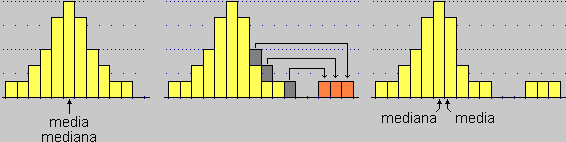 Se ho un istogramma di distribuzione dalla forma simmetrica, in cui media e mediana cadono entrambe nella classe centrale, e tolgo pezzi da colonne a destra della colonna centrale e li sposto più a destra, la media ovviamente aumenta (alcuni dati sono sostituiti da dati dal valore maggiore) mentre la mediana resta immutata (infatti alla sua destra e alla sua sinistra rimane comunque il 50% dei dati):