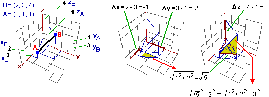 Sopra a destra viene motivata questa estensione: il segmento AB viene pensato nel piano verticale che lo contiene; la sua lunghezza è la radice quadrata della somma dei quadrati della variazione verticale, che è 4, e della variazione orizzontale, che viene ricavata come illustrato nella figura al centro, come distanza delle "proiezioni" di A e B sul piano individuato dagli assi x e y.