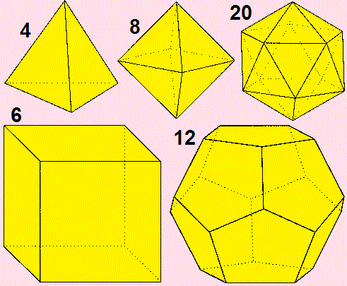 I poliedri regolari (o solidi regolari o solidi platonici o ) sono i poliedri convessi (ossia senza concavità) che hanno tutte le facce eguali. Sono 5 ed hanno uguali, in ordine, 4 (tetraedro regolare), 6 (esaedro r. o cubo), 8 (ottaedro r.), 12 (dodecaedro r.) e 20 (icosaedro r.) facce.
