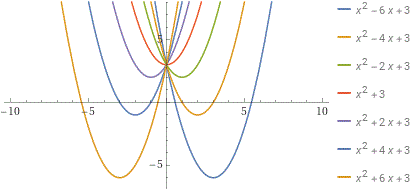 plot y = x^2 + b*x + 3 for b = -6, -4, -2, 0, 2, 4, 6, x=-10..10, y=-8..8
