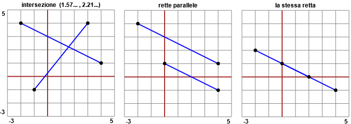 rette per (-2,4), (4,1) e per (-1,-1), (3,4); intersezione (1.571428571428571..., 2.214285714285714...)