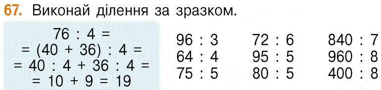 76 : 2 = (60 + 16) / 2 = 60/2 + 16/2 = 30 + 8 = 38